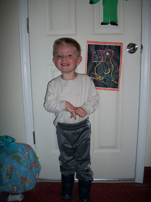 Being a big boy. I am not pushing potty training at all, but he frequently asks to wear his Diego's and go to the bathroom and use "toilet papers." Plus, it's a cute little plumbers crack picture:)